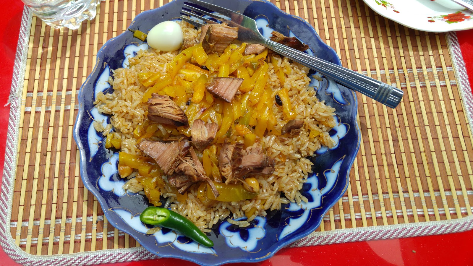 The road isn’t bad compared to streets in Samakand and Timur drives in the Uzbek style so we got to Termez in what I can only assume was record time. We stopped at a slightly scary looking place for lunch that turned out to have a lovely garden out back where Timur and I and a friend of his we picked up along the way ate big plates of plov, the standard central Asian dish of rice and yellow carrots and chunks of meat, and lamb shashlik (kebab), food was all good. Uzbek food is simple and basic and always good or at worst fine.