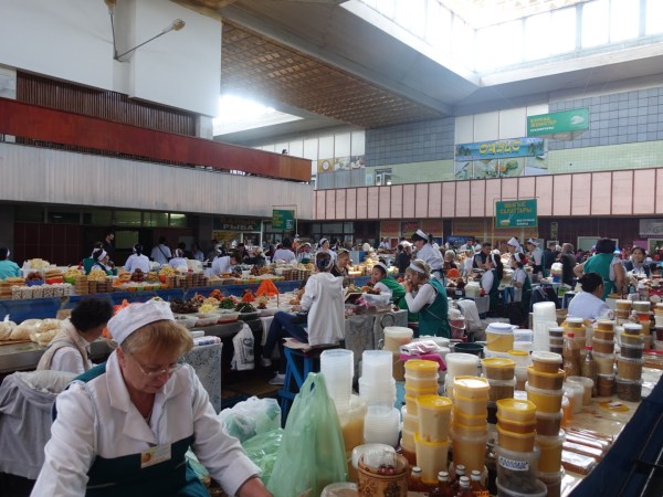 In the basement under the market there are a bunch of really little, plain restaurants. Went to one for lunch, wonderful food, lagman (meat and noodles) and some sort of garlicy greens and these steamed pockets of meat, all of it really good.