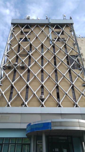Kazakh telecom building, apparently not everyone is a fan, I happen to love it, the tubular mesh is the load bearing portion of the building, leaving almost the entire interior available for telecom and wiring.