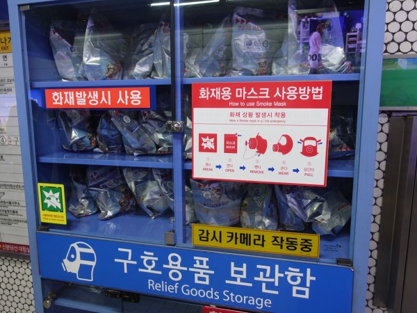 Gasmasks and emergency equipment are available in each station.