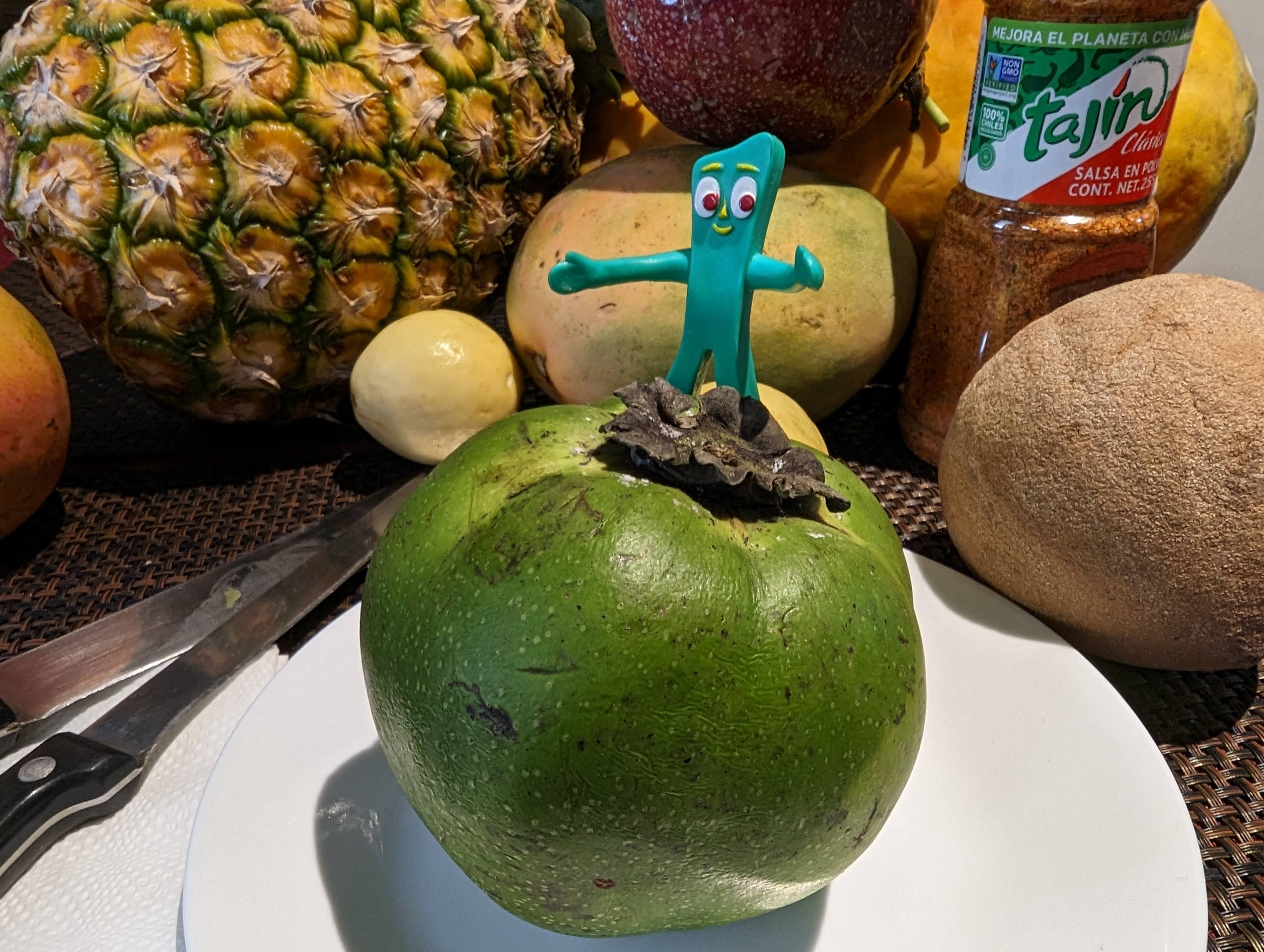 It kinda looks like some unripe cousin to a pomegranate and when I bought it the skin was nearly as hard. Overnight, however, the skin became more leathery and submits to a firm thumb.
