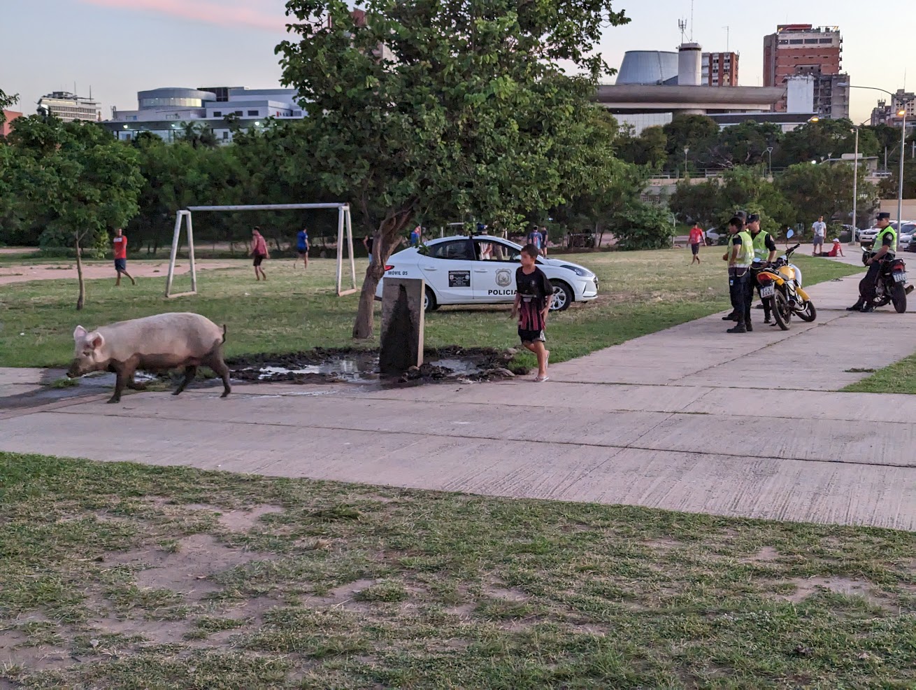 Yes, this is a picture of four cops flummoxed at how to deal with a pig in the mud. They took pictures, made calls, conferred with each other…Eventually one of the kids playing soccer there came over and shooed it away.