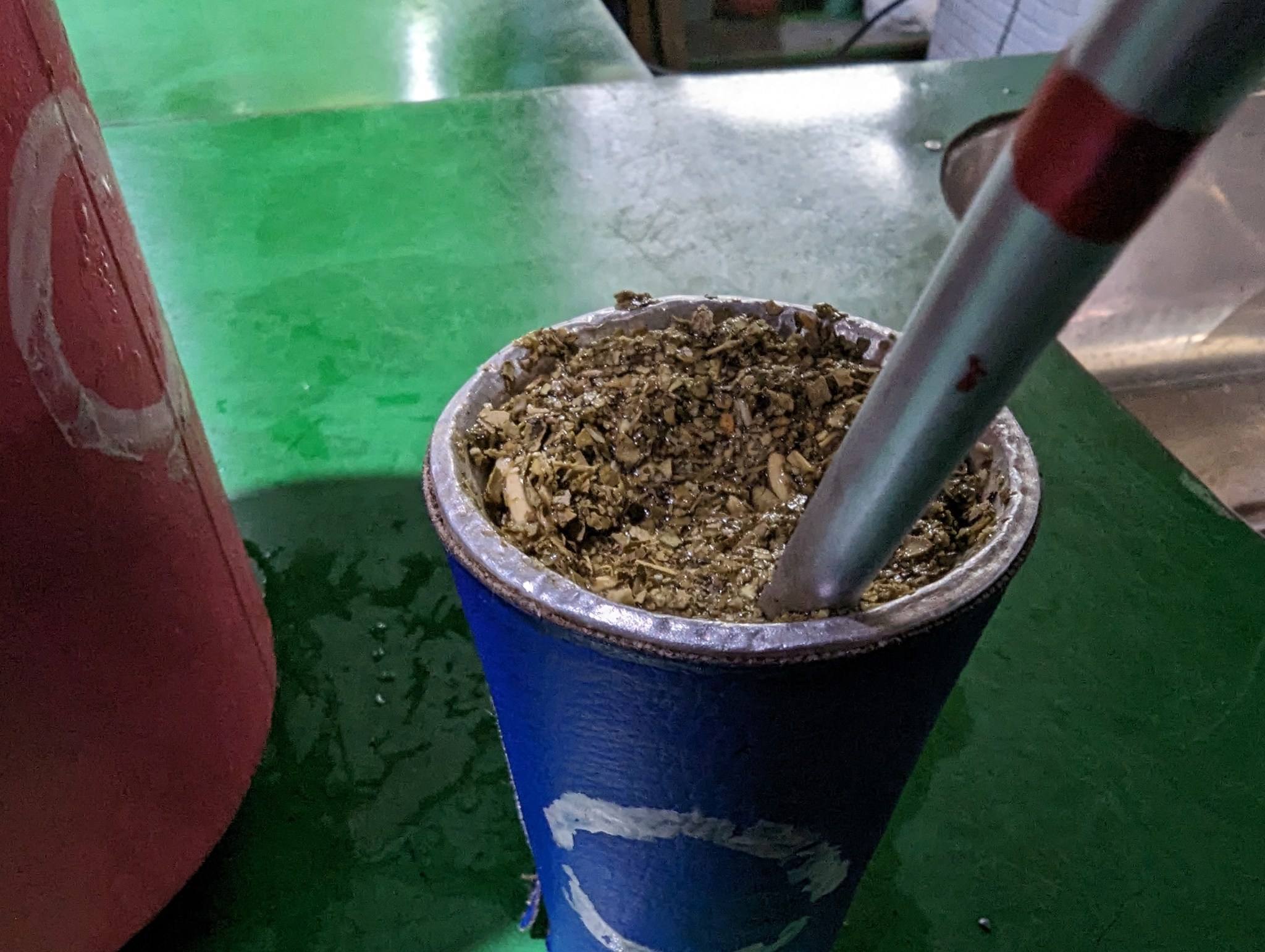 I told her in my terrible Spanish that I had never had tereré before, she looked skeptical but showed me how it works. She opened a cooler, took out a cylinder of ice that made from water infused with the various herbs (other than the yerba mate itself), added the ice to a pitcher of cold water (the termo), filled a cup (the guampa) to the brim with yerba mate leaves, and handed me a metal straw with a built in filter (the bombilla). She poured some water into my cup and indicated that I am to drink it immediately, no steeping, and to then repeat, forever.